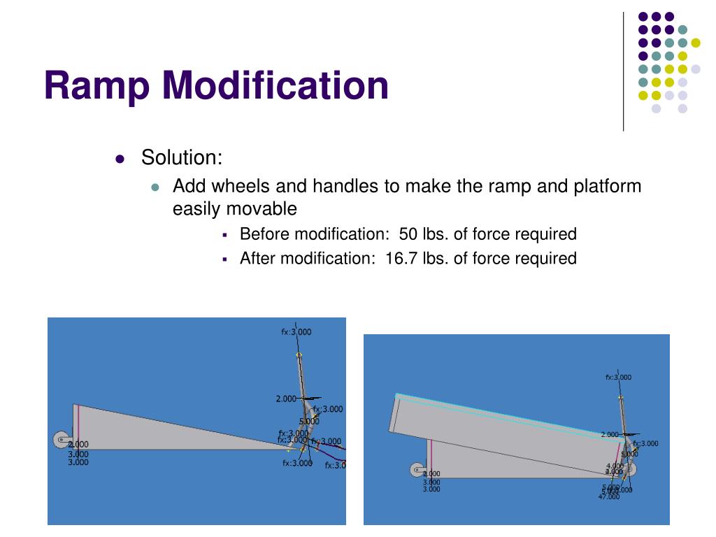 Ramp Modification • Solution: • Add wheels and handles to make the ramp and platform easily movable • Before modification: 50 lbs. of force required • After modification: 16.7 lbs. of force required