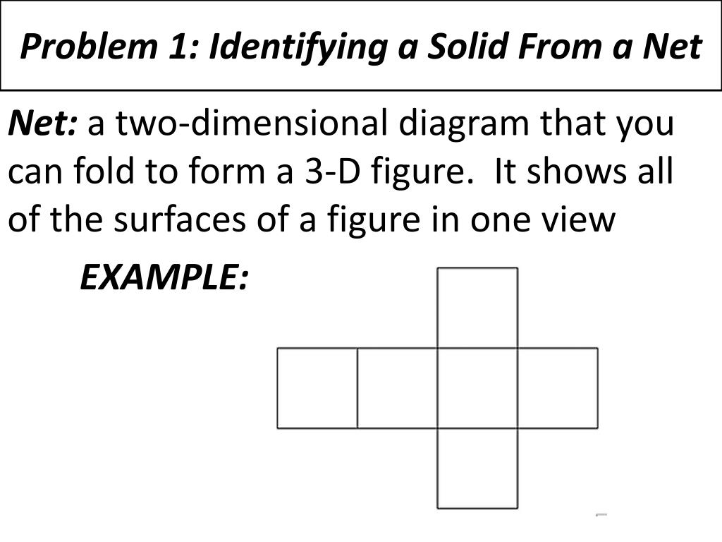 Problem 1: Identifying a Solid From a Net Net: a two-dimensional diagram that you can fold to form a 3-D figure. It shows all of the surfaces of a figure in one view EXAMPLE: