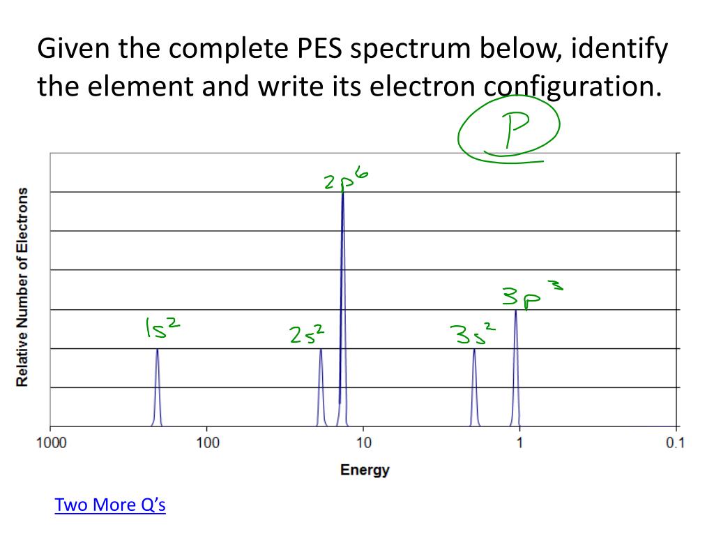 Given the complete PES spectrum below, identify the element and write its electron configuration. Two More Q’s