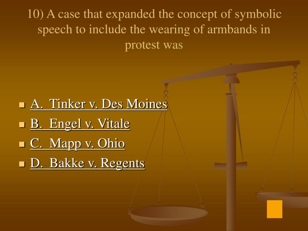 10) A case that expanded the concept of symbolic speech to include the wearing of armbands in protest was • A. Tinker v. Des Moines • B. Engel v. Vitale • C. Mapp v. Ohio • D. Bakke v. Regents