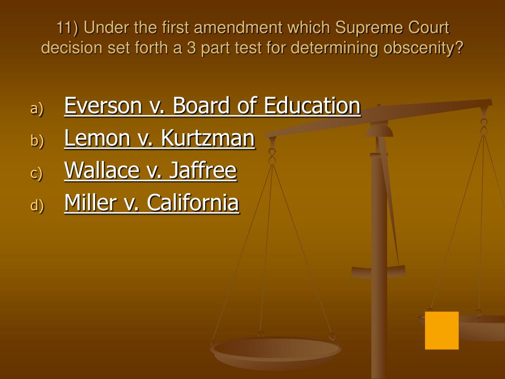 11) Under the first amendment which Supreme Court decision set forth a 3 part test for determining obscenity? • Everson v. Board of Education • Lemon v. Kurtzman • Wallace v. Jaffree • Miller v. California