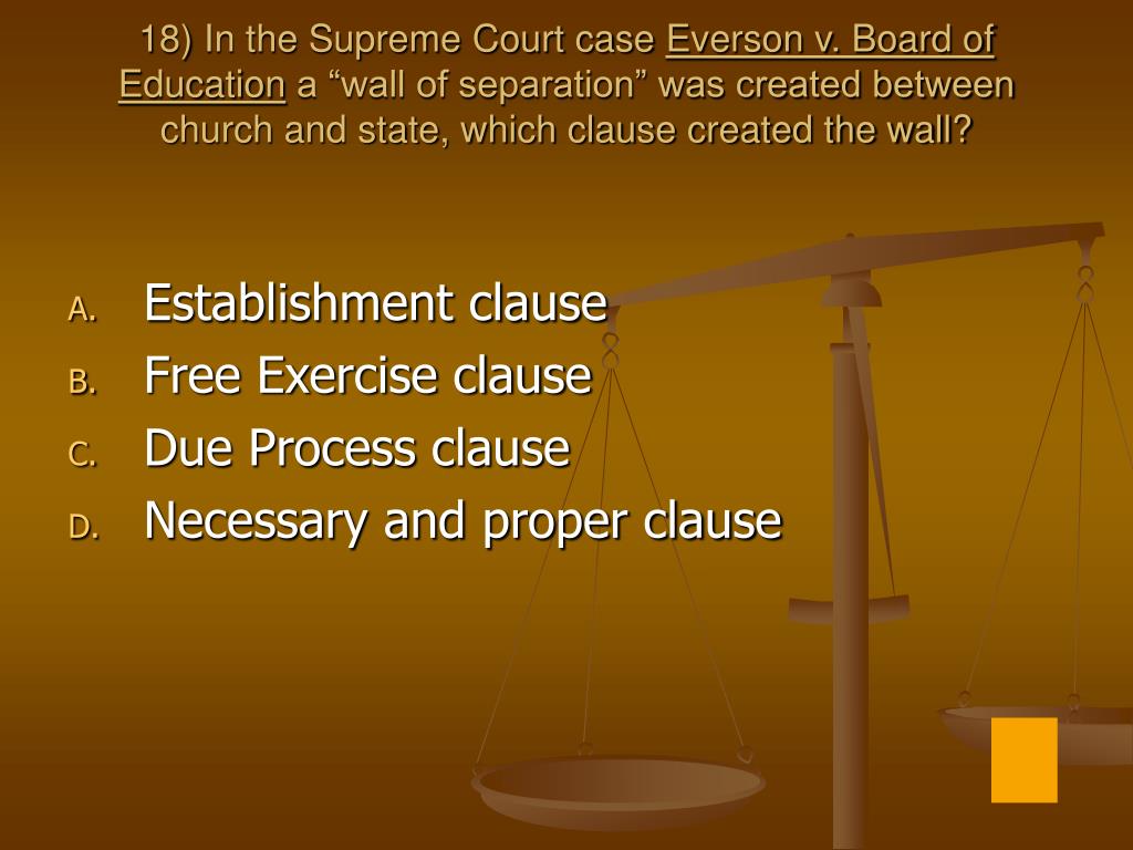 18) In the Supreme Court case Everson v. Board of Education a “wall of separation” was created between church and state, which clause created the wall? • Establishment clause • Free Exercise clause • Due Process clause • Necessary and proper clause