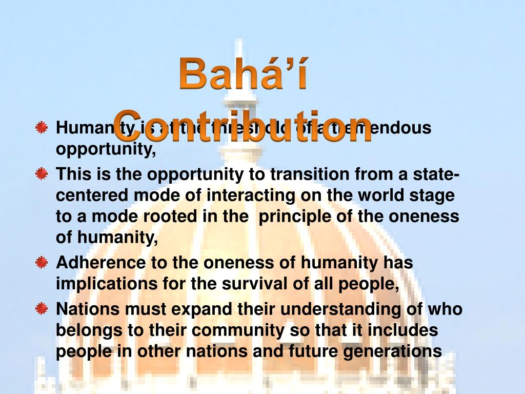 Bahá’í Contribution • Humanity is at the threshold of a tremendous opportunity, • This is the opportunity to transition from a state-centered mode of interacting on the world stage to a mode rooted in the principle of the oneness of humanity, • Adherence to the oneness of humanity has implications for the survival of all people, • Nations must expand their understanding of who belongs to their community so that it includes people in other nations and future generations