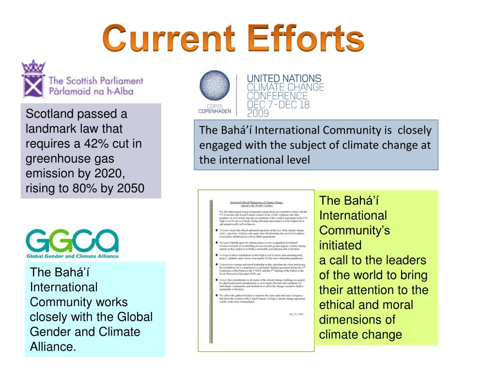 Current Efforts Scotland passed a landmark law that requires a 42% cut in greenhouse gas emission by 2020, rising to 80% by 2050 The Bahá’í International Community is closely engaged with the subject of climate change at the international level The Bahá’í International Community’s initiated a call to the leaders of the world to bring their attention to the ethical and moral dimensions of climate change The Bahá’í International Community works closely with the Global Gender and Climate Alliance.