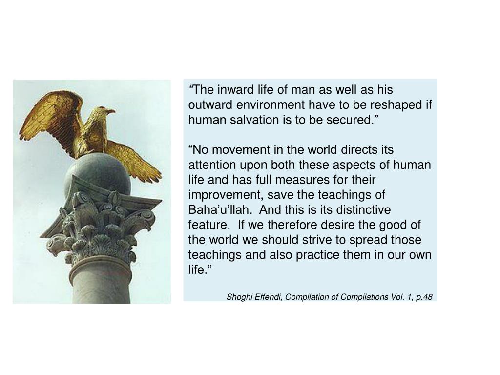 “The inward life of man as well as his outward environment have to be reshaped if human salvation is to be secured.” “No movement in the world directs its attention upon both these aspects of human life and has full measures for their improvement, save the teachings of Baha’u’llah. And this is its distinctive feature. If we therefore desire the good of the world we should strive to spread those teachings and also practice them in our own life.” Shoghi Effendi, Compilation of Compilations Vol. 1, p.48