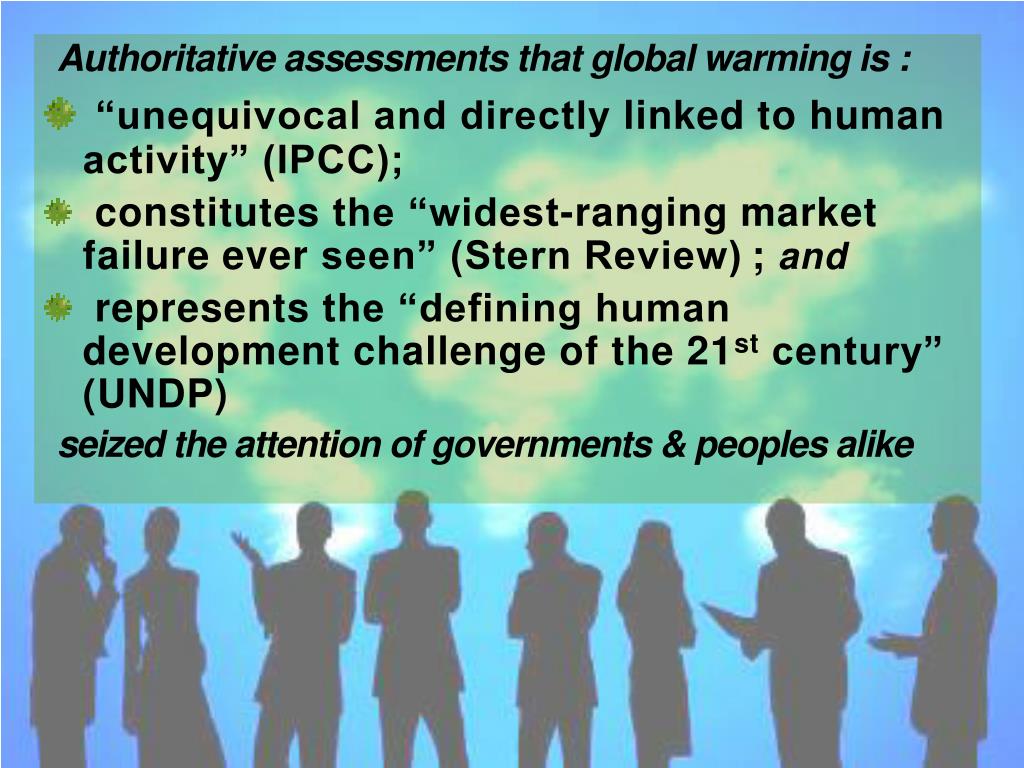 Authoritative assessments that global warming is : • “unequivocal and directly linked to human activity” (IPCC); • constitutes the “widest-ranging market failure ever seen” (Stern Review); and • represents the “defining human development challenge of the 21stcentury” (UNDP) seized the attention of governments & peoples alike