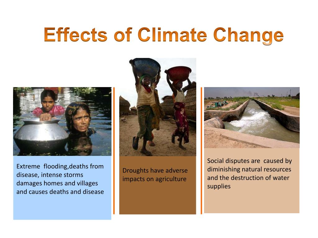 Effects of Climate Change Social disputes are caused by diminishing natural resources and the destruction of water supplies Extreme flooding,deaths from disease, intense storms damages homes and villages and causes deaths and disease Droughts have adverse impacts on agriculture