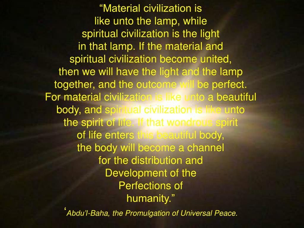 “Material civilization is like unto the lamp, while spiritual civilization is the light in that lamp. If the material and spiritual civilization become united, then we will have the light and the lamp together, and the outcome will be perfect. For material civilization is like unto a beautiful body, and spiritual civilization is like unto the spirit of life. If that wondrous spirit of life enters this beautiful body, the body will become a channel for the distribution and Development of the Perfections of humanity.” ‘Abdu’l-Baha, the Promulgation of Universal Peace.
