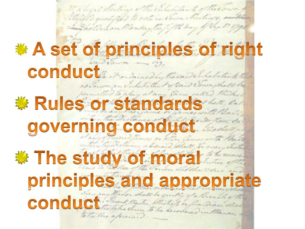 A set of principles of right conduct • Rules or standards governing conduct • The study of moral principles and appropriate conduct