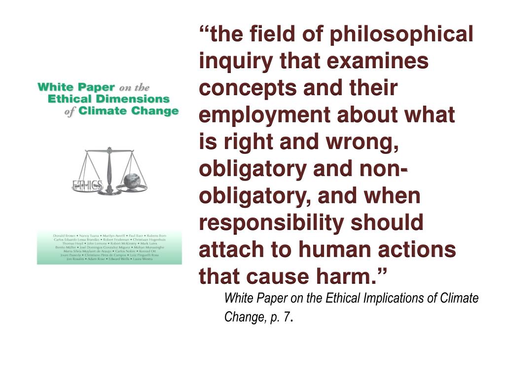 “the field of philosophical inquiry that examines concepts and their employment about what is right and wrong, obligatory and non-obligatory, and when responsibility should attach to human actions that cause harm.” • White Paper on the Ethical Implications of Climate Change, p. 7.