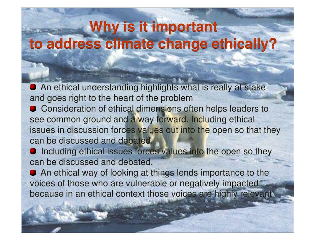 Why is it important to address climate change ethically? • An ethical understanding highlights what is really at stake and goes right to the heart of the problem • Consideration of ethical dimensions often helps leaders to see common ground and a way forward. Including ethical issues in discussion forces values out into the open so that they can be discussed and debated. • Including ethical issues forces values into the open so they can be discussed and debated. • An ethical way of looking at things lends importance to the voices of those who are vulnerable or negatively impacted because in an ethical context those voices are highly relevant