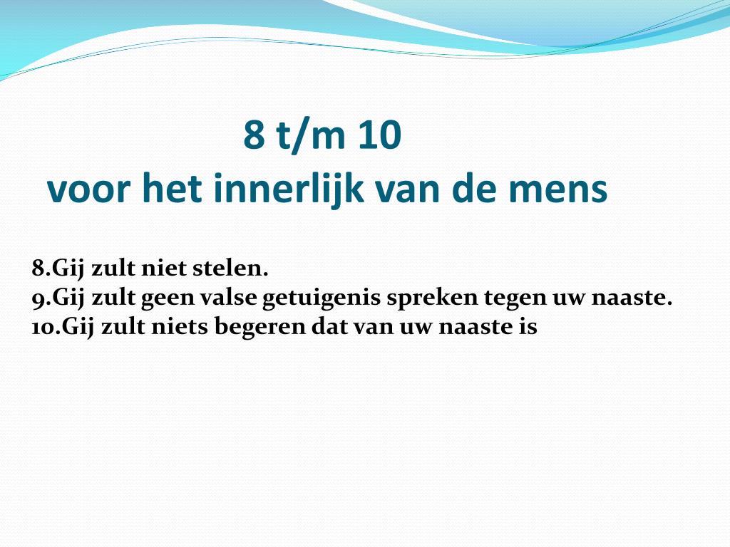 8 t/m 10 voor het innerlijk van de mens 8.Gij zult niet stelen. 9.Gij zult geen valse getuigenis spreken tegen uw naaste. 10.Gij zult niets begeren dat van uw naaste is