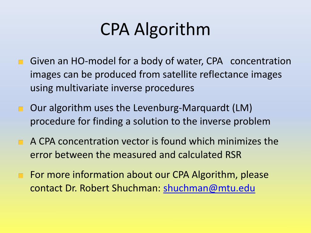 CPA Algorithm • Given an HO-model for a body of water, CPA concentration images can be produced from satellite reflectance images using multivariate inverse procedures • Our algorithm uses the Levenburg-Marquardt (LM) procedure for finding a solution to the inverse problem • A CPA concentration vector is found which minimizes the error between the measured and calculated RSR • For more information about our CPA Algorithm, please contact Dr. Robert Shuchman: shuchman@mtu.edu