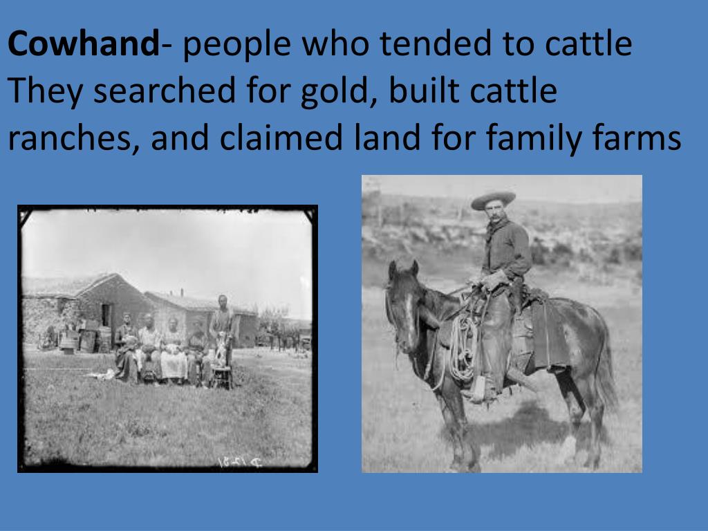 Cowhand- people who tended to cattleThey searched for gold, built cattle ranches, and claimed land for family farms