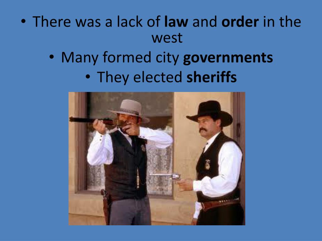 There was a lack of law and order in the west • Many formed city governments • They elected sheriffs