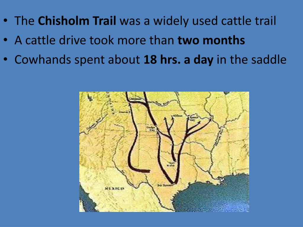 The Chisholm Trail was a widely used cattle trail • A cattle drive took more than two months • Cowhands spent about 18 hrs. a day in the saddle