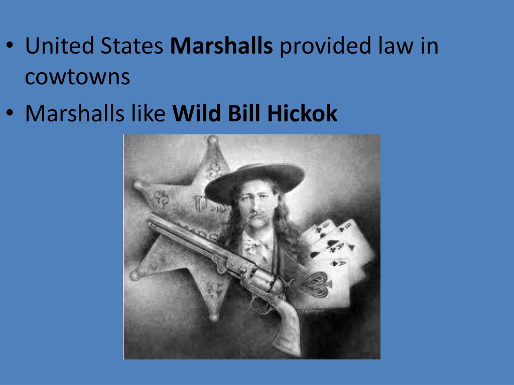United States Marshalls provided law in cowtowns • Marshalls like Wild Bill Hickok