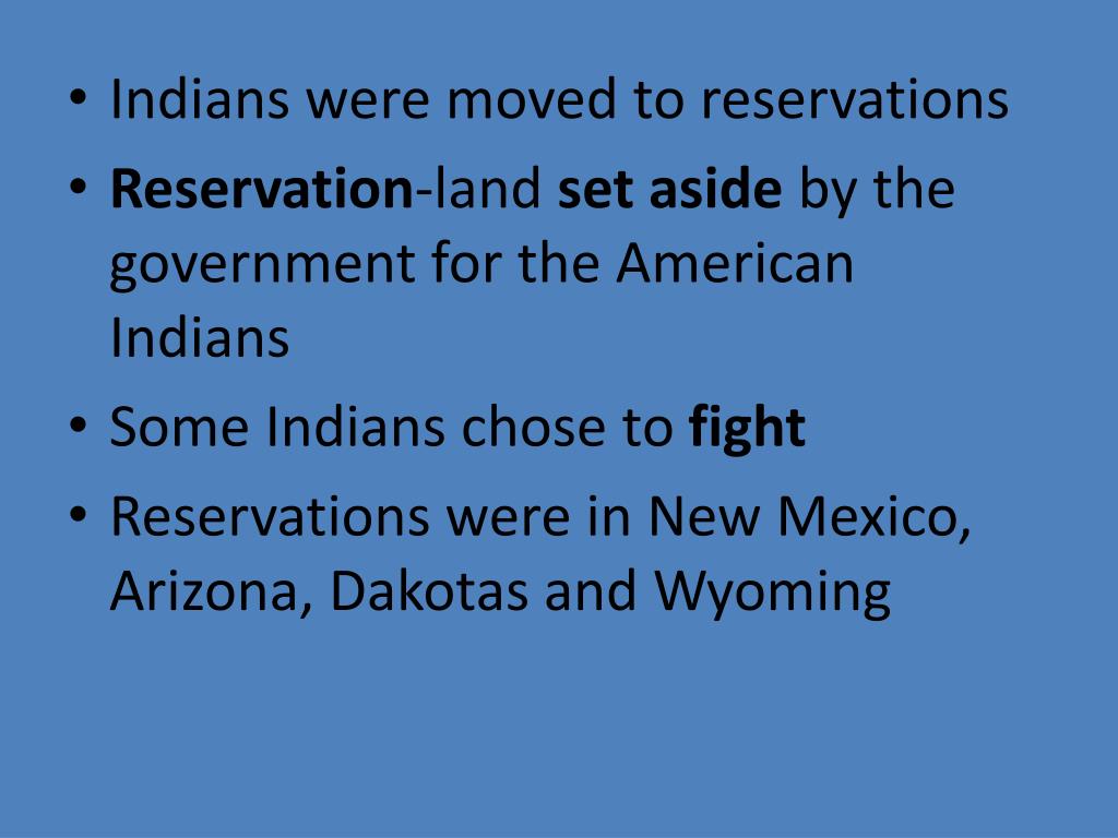 Indians were moved to reservations • Reservation-land set aside by the government for the American Indians • Some Indians chose to fight • Reservations were in New Mexico, Arizona, Dakotas and Wyoming
