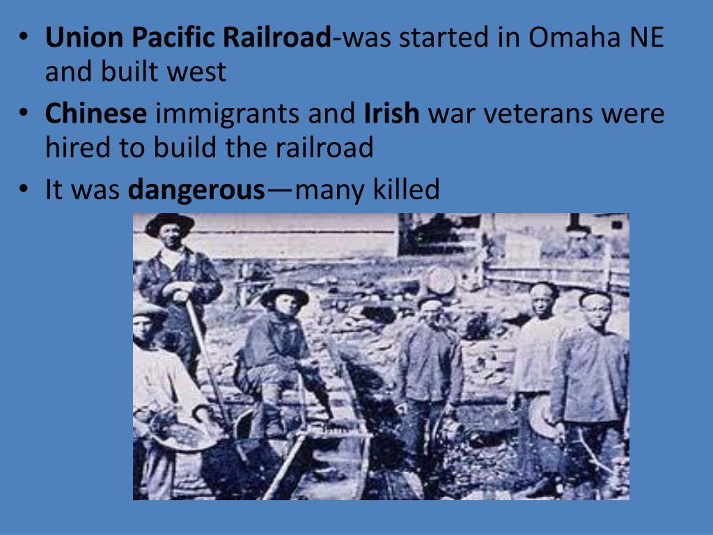 Union Pacific Railroad-was started in Omaha NE and built west • Chinese immigrants and Irish war veterans were hired to build the railroad • It was dangerous—many killed