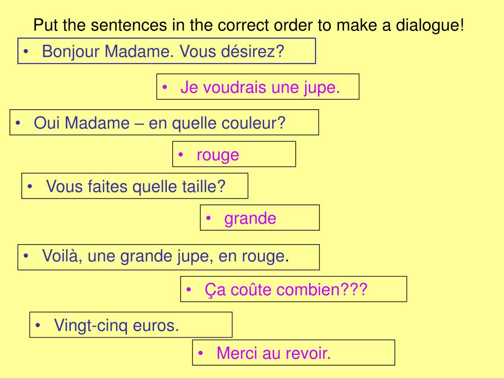 Put the sentences in the correct order to make a dialogue! • Bonjour Madame. Vous désirez? • Je voudrais une jupe. • Oui Madame – en quelle couleur? • rouge • Vous faites quelle taille? • grande • Voilà,une grande jupe, en rouge. • Ça coûte combien??? • Vingt-cinq euros. • Merci au revoir.