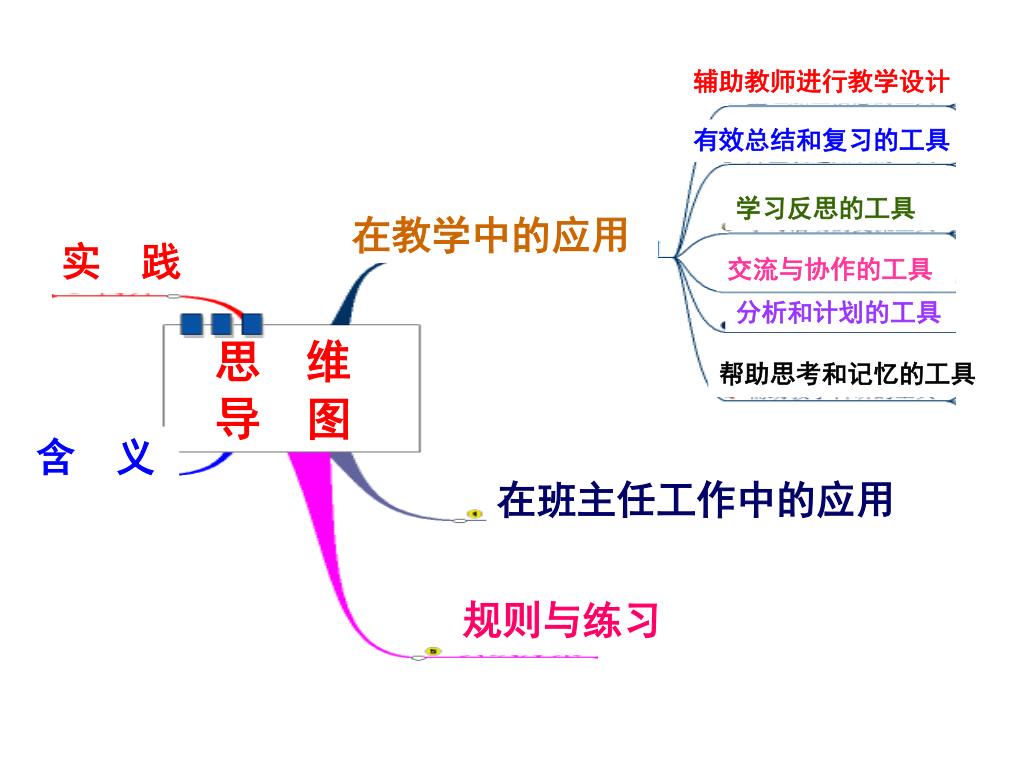 辅助教师进行教学设计 有效总结和复习的工具 学习反思的工具 在教学中的应用 实 践 交流与协作的工具 分析和计划的工具 思 维 导 图 帮助思考和记忆的工具 含 义 在班主任工作中的应用 规则与练习