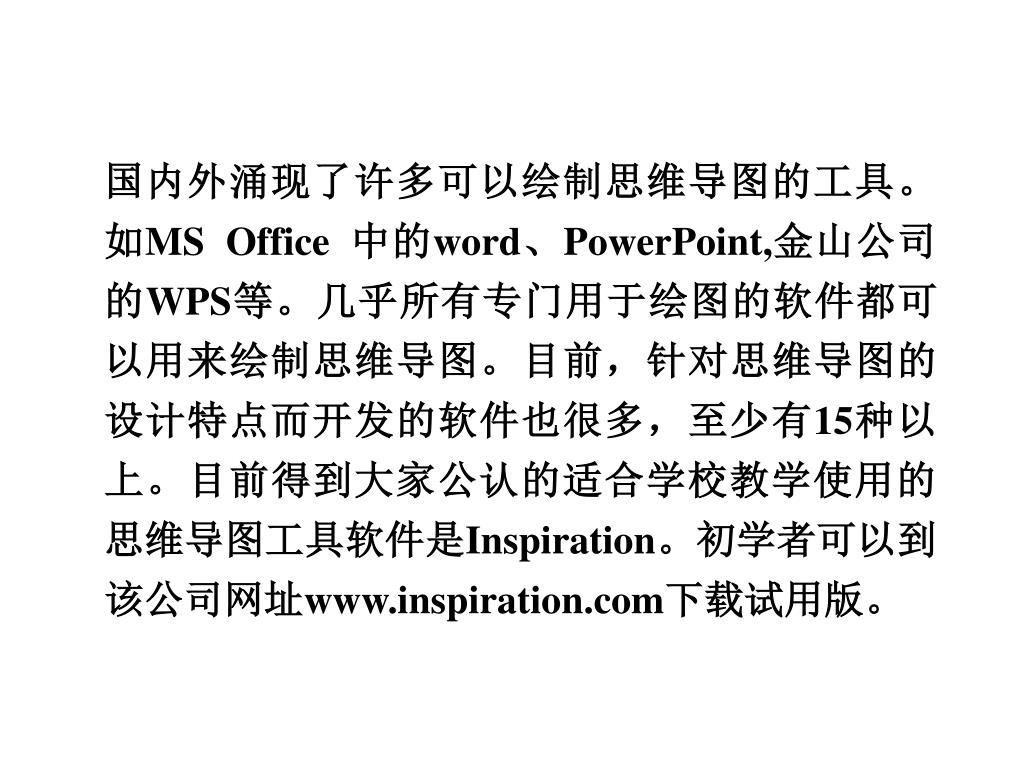 国内外涌现了许多可以绘制思维导图的工具。 如MS Office 中的word、PowerPoint,金山公司的WPS等。几乎所有专门用于绘图的软件都可以用来绘制思维导图。目前,针对思维导图的设计特点而开发的软件也很多,至少有15种以上。目前得到大家公认的适合学校教学使用的思维导图工具软件是Inspiration。初学者可以到该公司网址www.inspiration.com下载试用版。