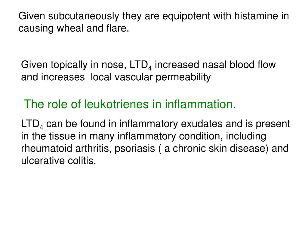 Given subcutaneously they are equipotent with histamine in causing wheal and flare. Given topically in nose, LTD4 increased nasal blood flow and increases local vascular permeability The role of leukotrienes in inflammation. LTD4 can be found in inflammatory exudates and is present in the tissue in many inflammatory condition, including rheumatoid arthritis, psoriasis ( a chronic skin disease) and ulcerative colitis.