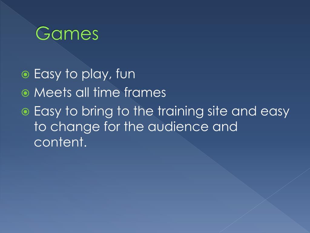 Games • Easy to play, fun • Meets all time frames • Easy to bring to the training site and easy to change for the audience and content.