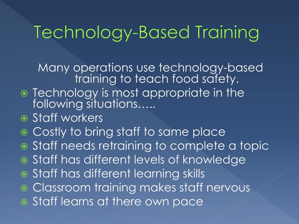 Technology-Based Training Many operations use technology-based training to teach food safety. • Technology is most appropriate in the following situations….. • Staff workers • Costly to bring staff to same place • Staff needs retraining to complete a topic • Staff has different levels of knowledge • Staff has different learning skills • Classroom training makes staff nervous • Staff learns at there own pace