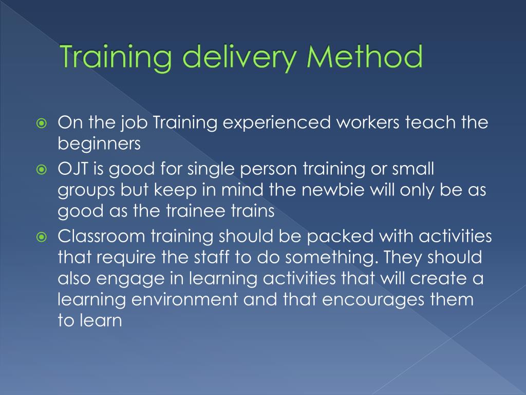 Training delivery Method • On the job Training experienced workers teach the beginners • OJT is good for single person training or small groups but keep in mind the newbie will only be as good as the trainee trains • Classroom training should be packed with activities that require the staff to do something. They should also engage in learning activities that will create a learning environment and that encourages them to learn