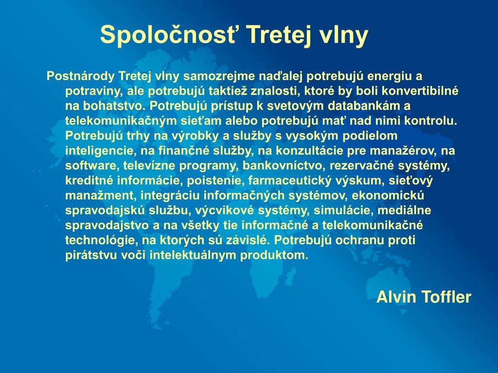 Spoločnosť Tretej vlny Postnárody Tretej vlny samozrejme naďalej potrebujú energiu a potraviny, ale potrebujú taktiež znalosti, ktoré by boli konvertibilné na bohatstvo. Potrebujú prístup k svetovým databankám a telekomunikačným sieťam alebo potrebujú mať nad nimi kontrolu. Potrebujú trhy na výrobky a služby s vysokým podielom inteligencie, na finančné služby, na konzultácie pre manažérov, na software, televízne programy, bankovníctvo, rezervačné systémy, kreditné informácie, poistenie, farmaceutický výskum, sieťový manažment, integráciu informačných systémov, ekonomickú spravodajskú službu, výcvikové systémy, simulácie, mediálne spravodajstvo a na všetky tie informačné a telekomunikačné technológie, na ktorých sú závislé. Potrebujú ochranu proti pirátstvu voči intelektuálnym produktom. Alvin Toffler