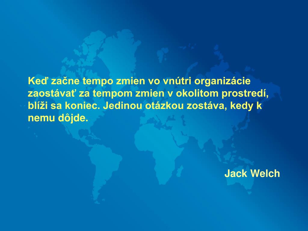 Keď začne tempo zmien vo vnútri organizácie zaostávať za tempom zmien v okolitom prostredí, blíži sa koniec. Jedinou otázkou zostáva, kedy k nemu dôjde. Jack Welch