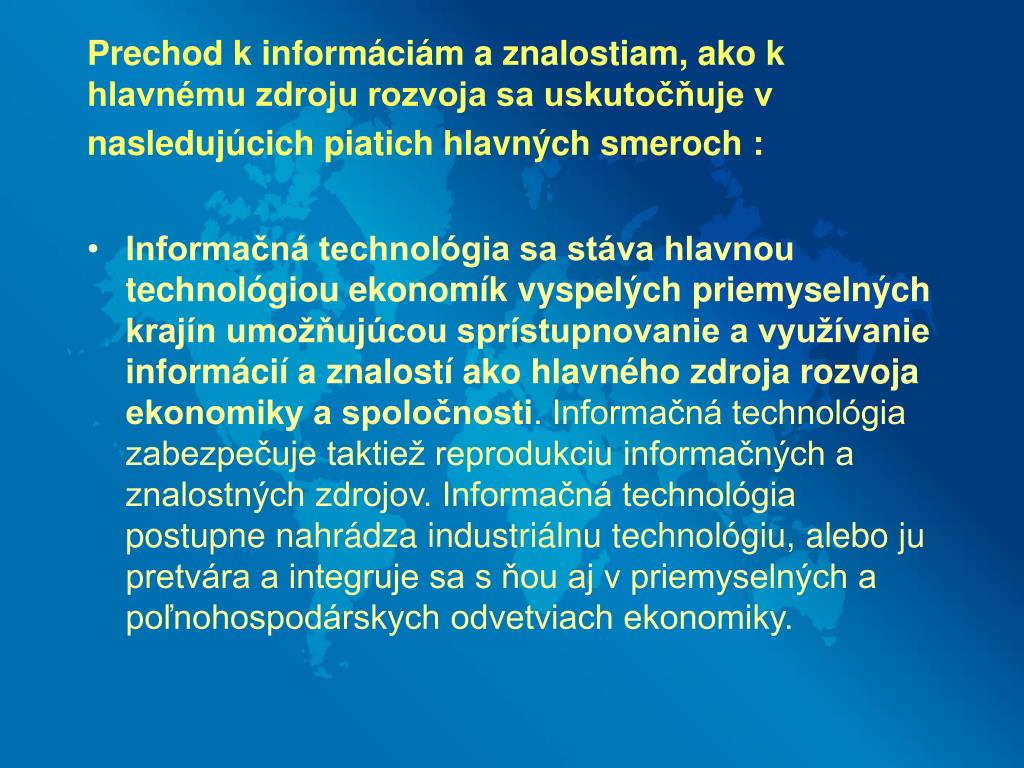 Prechod k informáciám a znalostiam, ako k hlavnému zdroju rozvoja sa uskutočňuje v nasledujúcich piatich hlavných smeroch : • Informačná technológia sa stáva hlavnou technológiou ekonomík vyspelých priemyselných krajín umožňujúcou sprístupnovanie a využívanie informácií a znalostí ako hlavného zdroja rozvoja ekonomiky a spoločnosti. Informačná technológia zabezpečuje taktiež reprodukciu informačných a znalostných zdrojov. Informačná technológia postupne nahrádza industriálnu technológiu, alebo ju pretvára a integruje sa s ňou aj v priemyselných a poľnohospodárskych odvetviach ekonomiky.