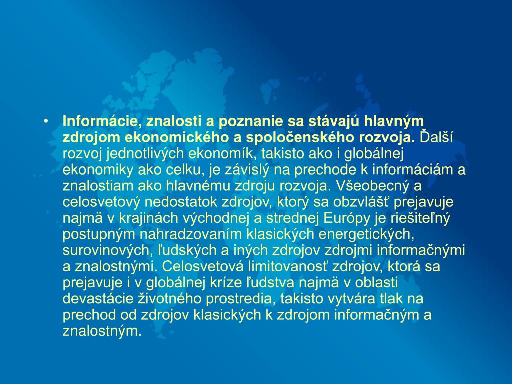 Informácie, znalosti a poznanie sa stávajú hlavným zdrojom ekonomického a spoločenského rozvoja. Ďalší rozvoj jednotlivých ekonomík, takisto ako i globálnej ekonomiky ako celku, je závislý na prechode k informáciám a znalostiam ako hlavnému zdroju rozvoja. Všeobecný a celosvetový nedostatok zdrojov, ktorý sa obzvlášť prejavuje najmä v krajinách východnej a strednej Európy je riešiteľný postupným nahradzovaním klasických energetických, surovinových, ľudských a iných zdrojov zdrojmi informačnými a znalostnými. Celosvetová limitovanosť zdrojov, ktorá sa prejavuje i v globálnej kríze ľudstva najmä v oblasti devastácie životného prostredia, takisto vytvára tlak na prechod od zdrojov klasických k zdrojom informačným a znalostným.