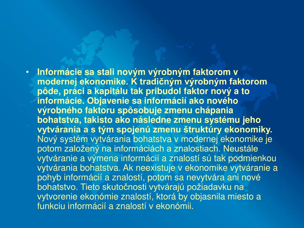 Základné charakteristiky informačnej teórie hodnoty • Informácie pôsobia antientropicky teda proti zvyšovaniu entropie • Informácie in-formujú čiže vytvárajú štruktúru ekonomiky a spoločnosti • Generovanie informácií a ich vteľovanie do produktov vytvára nerovnováhu v tých častiach ekonomiky, v ktorých konkurenčné produkty neobsahujú práve generované informácie • Produkt, ktorý vzniká na základe generovaných informácií, získava väčší podiel na trhu • Rozširovanie čiže disipácia informácií a ich vteľovanie do konkurenčných produktov potom zasa rovnováhu obnovuje • Informácie sa do nového produktu vteľujú tak, že tento vzniká ako nová kombinácia informácií a starého produktu • Týmto spôsobom prebieha proces kreatívnej deštrukcie v informačnej spoločnosti • Nové smery vývoja, ktoré bývajú väčšinou uvádzané ako informačné technológie, nové materiály a biotechnológie, nie sú nič iné ako nové kombinácie starých výrobných faktorov s informáciami • V globálnej svetovej ekonomike, krajina, ktorá investuje do informačných technológií, informatizácie, vedy, výskumu atď. získava potom väčší podiel na trhoch a v krajinách, ktoré do informatizácie neinvestujú, dochádza potom k rastu ekonomickej nerovnováhy