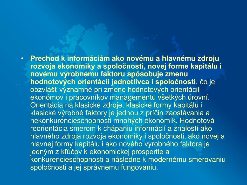 Prechod k informáciám ako novému a hlavnému zdroju rozvoja ekonomiky a spoločnosti, novej forme kapitálu i novému výrobnému faktoru spôsobuje zmenu hodnotových orientácií jednotlivca i spoločnosti, čo je obzvlášť významné pri zmene hodnotových orientácií ekonómov i pracovníkov managementu všetkých úrovní. Orientácia na klasické zdroje, klasické formy kapitálu i klasické výrobné faktory je jednou z príčin zaostávania a nekonkurencieschopnosti mnohých ekonomík. Hodnotová reorientácia smerom k chápaniu informácií a znalostí ako hlavného zdroja rozvoja ekonomiky i spoločnosti, ako novej a hlavnej formy kapitálu i ako nového výrobného faktora je jedným z kľúčov k ekonomickej prosperite a konkurencieschopnosti a následne k modernému smerovaniu spoločnosti a jej správnemu fungovaniu.