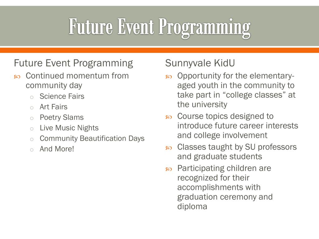 Future Event Programming Future Event Programming • Continued momentum from community day • Science Fairs • Art Fairs • Poetry Slams • Live Music Nights • Community Beautification Days • And More! Sunnyvale KidU • Opportunity for the elementary-aged youth in the community to take part in “college classes” at the university • Course topics designed to introduce future career interests and college involvement • Classes taught by SU professors and graduate students • Participating children are recognized for their accomplishments with graduation ceremony and diploma
