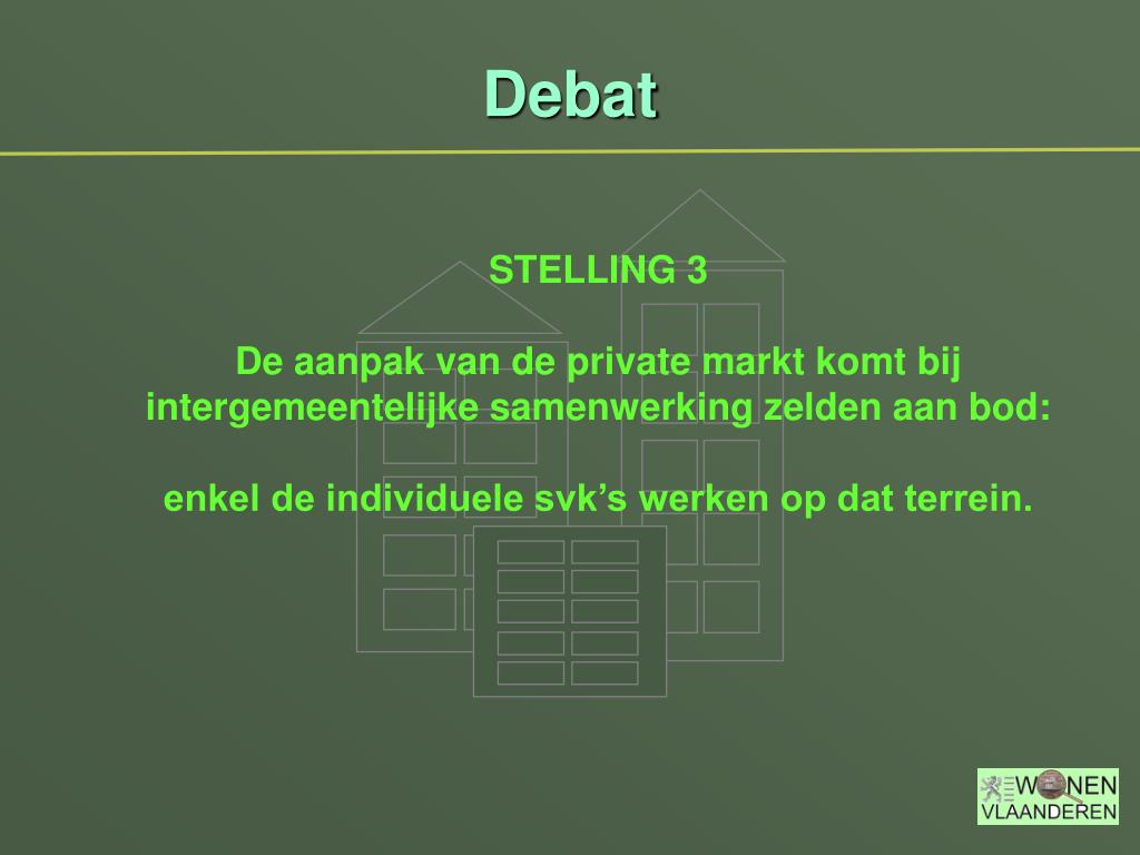 Debat • STELLING 3 • De aanpak van de private markt komt bij • intergemeentelijke samenwerking zelden aan bod: • enkel de individuele svk’s werken op dat terrein.