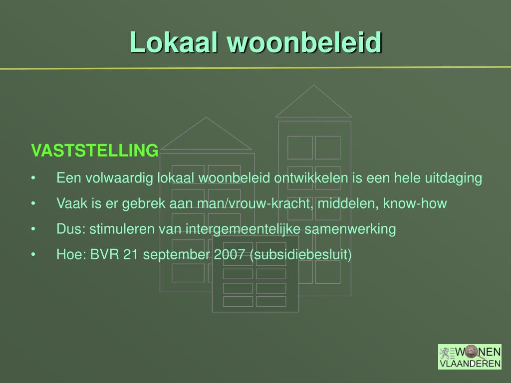 Lokaal woonbeleid • VASTSTELLING • Een volwaardig lokaal woonbeleid ontwikkelen is een hele uitdaging • Vaak is er gebrek aan man/vrouw-kracht, middelen, know-how • Dus: stimuleren van intergemeentelijke samenwerking • Hoe: BVR 21 september 2007 (subsidiebesluit)