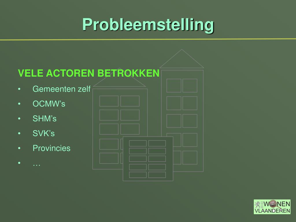 Probleemstelling • VELE ACTOREN BETROKKEN • Gemeenten zelf • OCMW’s • SHM’s • SVK’s • Provincies • …