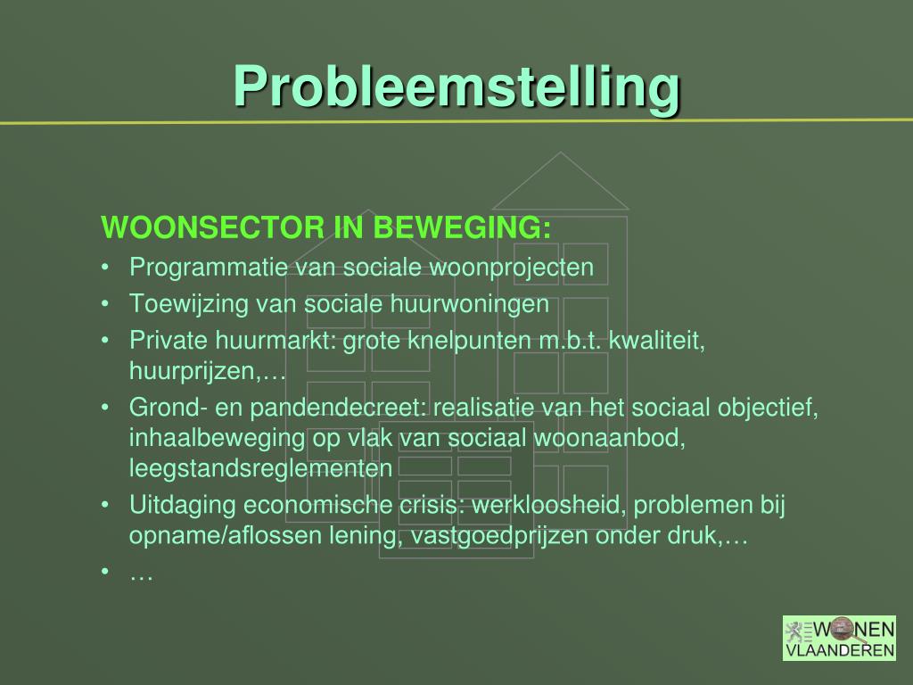 WOONSECTOR IN BEWEGING: Programmatie van sociale woonprojecten Toewijzing van sociale huurwoningen Private huurmarkt: grote knelpunten m.b.t. kwaliteit, huurprijzen,… Grond- en pandendecreet: realisatie van het sociaal objectief, inhaalbeweging op vlak van sociaal woonaanbod, leegstandsreglementen Uitdaging economische crisis: werkloosheid, problemen bij opname/aflossen lening, vastgoedprijzen onder druk,… … Probleemstelling