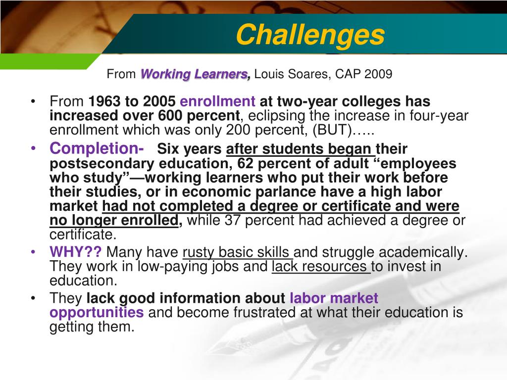 Challenges From Working Learners, Louis Soares, CAP 2009 • From 1963 to 2005 enrollment at two-year colleges has increased over 600 percent, eclipsing the increase in four-year enrollment which was only 200 percent, (BUT)….. • Completion- Six years after students began their postsecondary education, 62 percent of adult “employees who study”—working learners who put their work before their studies, or in economic parlance have a high labor market had not completed a degree or certificate and were no longer enrolled, while 37 percent had achieved a degree or certificate. • WHY?? Many have rusty basic skills and struggle academically. They work in low-paying jobs and lack resources to invest in education. • They lack good information about labor market opportunities and become frustrated at what their education is getting them.