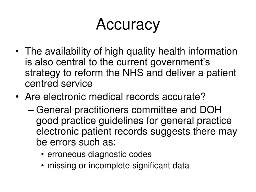 Accuracy • The availability of high quality health information is also central to the current government’s strategy to reform the NHS and deliver a patient centred service • Are electronic medical records accurate? • General practitioners committee and DOH good practice guidelines for general practice electronic patient records suggests there may be errors such as: • erroneous diagnostic codes • missing or incomplete significant data