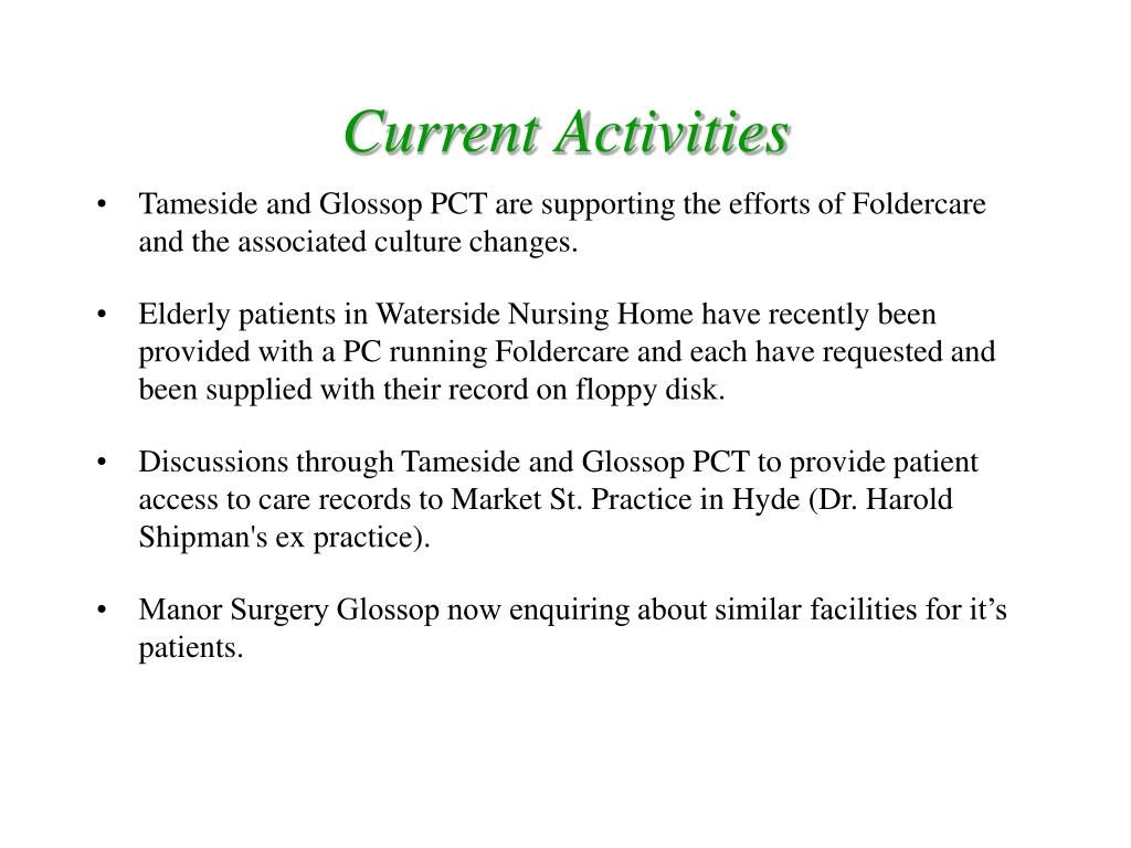 CurrentActivities • Tameside and Glossop PCT are supporting the efforts of Foldercare and the associated culture changes. • Elderly patients in Waterside Nursing Home have recently been provided with a PC running Foldercare and each have requested and been supplied with their record on floppy disk. • Discussions through Tameside and Glossop PCT to provide patient access to care records to Market St. Practice in Hyde (Dr. Harold Shipman's ex practice). • Manor Surgery Glossop now enquiring about similar facilities for it’s patients.