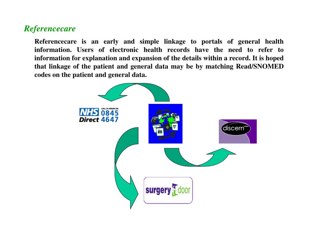 Referencecare Referencecare is an early and simple linkage to portals of general health information. Users of electronic health records have the need to refer to information for explanation and expansion of the details within a record. It is hoped that linkage of the patient and general data may be by matching Read/SNOMED codes on the patient and general data.