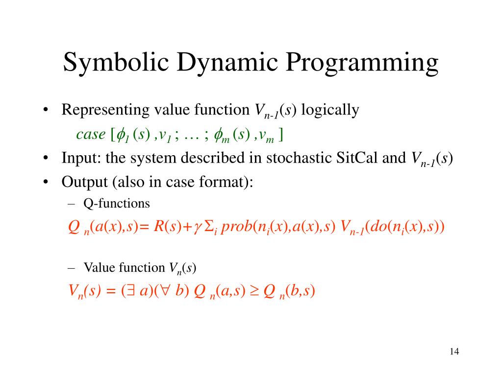 Symbolic Dynamic Programming • Representing value function Vn-1(s) logically case [1 (s) ,v1 ; … ; m (s) ,vm ] • Input: the system described in stochastic SitCal and Vn-1(s) • Output (also in case format): • Q-functions Q n(a(x),s)= R(s)+ iprob(ni(x),a(x),s) Vn-1(do(ni(x),s)) • Value function Vn(s) Vn(s) = ( a)( b) Q n(a,s) Q n(b,s)