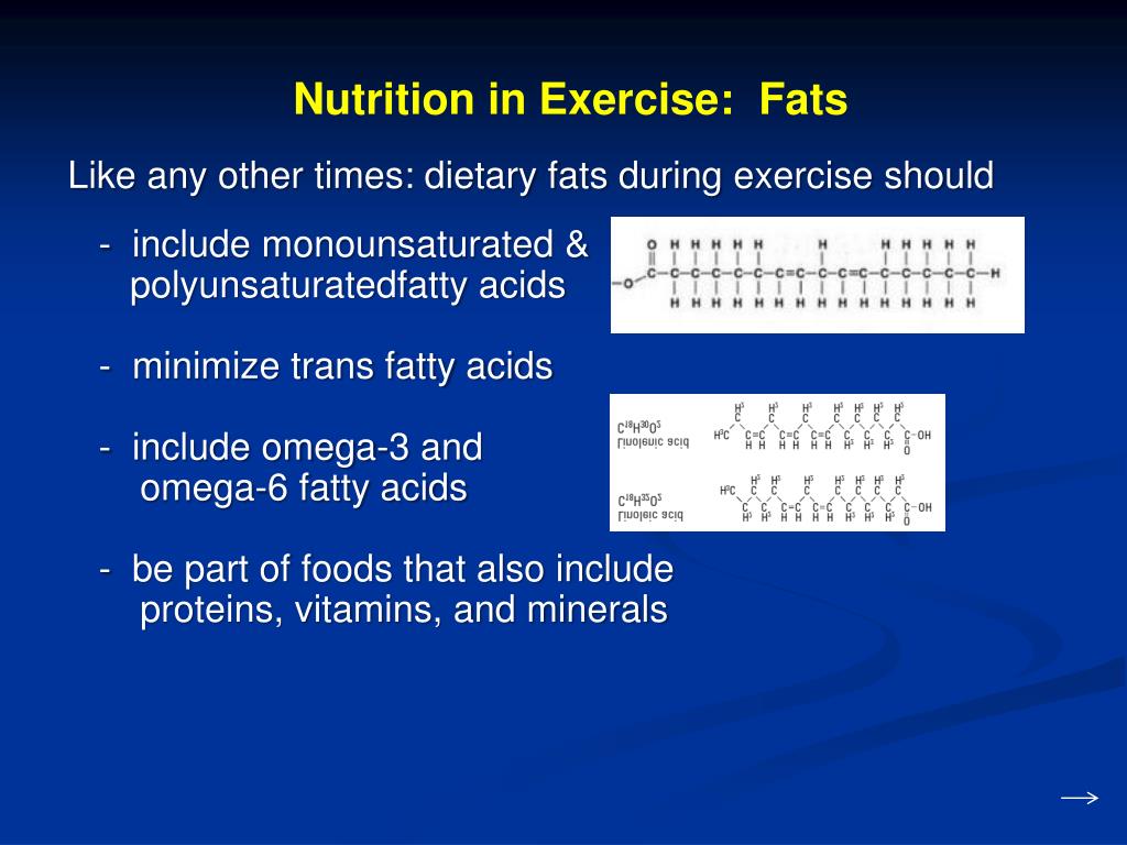 Nutrition in Exercise: Fats Like any other times: dietary fats during exercise should - include monounsaturated & polyunsaturatedfatty acids - minimize trans fatty acids - include omega-3 and omega-6 fatty acids - be part of foods that also include proteins, vitamins, and minerals