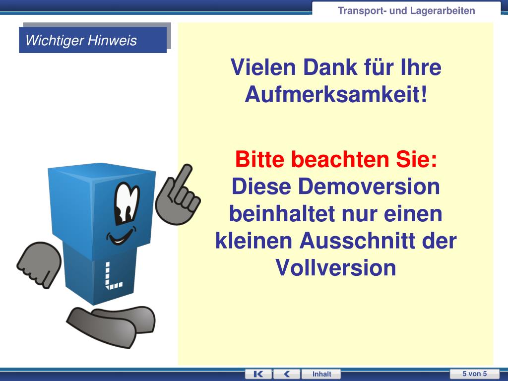 Vielen Dank für Ihre Aufmerksamkeit! Bitte beachten Sie:Diese Demoversion beinhaltet nur einen kleinen Ausschnitt der Vollversion Transport- und Lagerarbeiten Wichtiger Hinweis