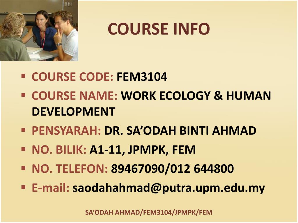 FEM3104 WORK ECOLOGY & HUMAN DEVELOPMENT COURSE INFO. DR. SA’ODAH BINTI AHMAD/JPMPK/FEM/UPM. COURSE INFO. COURSE CODE: FEM3104 COURSE NAME: WORK ECOLOGY & HUMAN DEVELOPMENT PENSYARAH: DR. SA’ODAH BINTI AHMAD NO. BILIK: A1-11, JPMPK, FEM NO. TELEFON: 89467090/012 644800