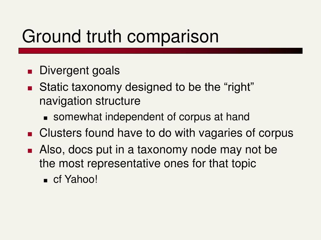Ground truth comparison • Divergent goals • Static taxonomy designed to be the “right” navigation structure • somewhat independent of corpus at hand • Clusters found have to do with vagaries of corpus • Also, docs put in a taxonomy node may not be the most representative ones for that topic • cf Yahoo!